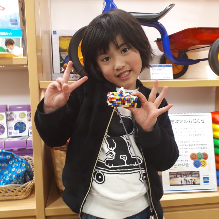 こんにちは。 今日は雪が降ってましたね。 寒い中イベントにご参加下さってありがとうございました。 今週末はハマビーズで立体のケーキを作ってもらいました。 小物入れにもなります。 がんばって、皆かわいいケーキ作ってくれました。 ハマビーズはビーズをボードに並べて好きな絵柄を作り、アイロンをかけると、溶けたビーズがくっつきあってひとつの作品ができあがります。 好きなデザインを形づくることの楽しさ、自分の手でものを作りだす…続きを読む